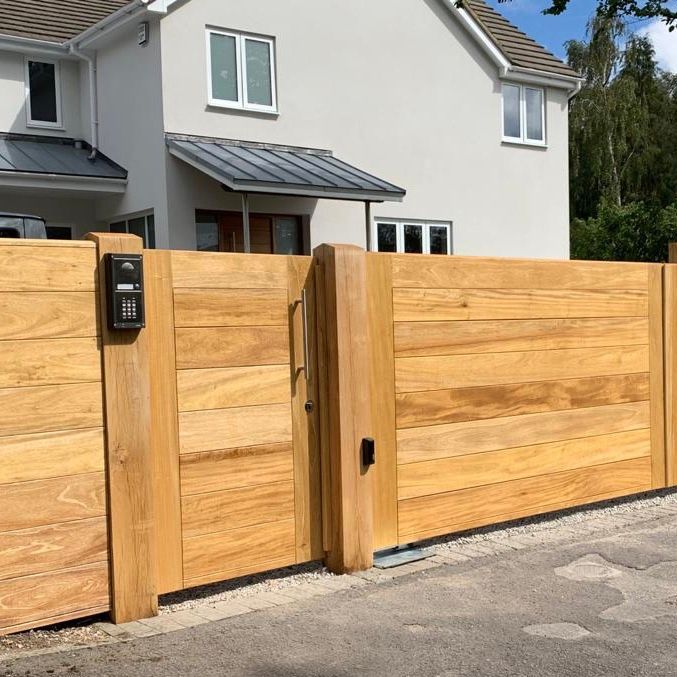 We specialise in hand made gates with or without automation in hardwoods such as Iroko, Sapele, Oak and Canadian Western Red Cedar which is a softwood but they are all very durable. Garage and pedestrian doors are also made to compliment our buildings. We provide a full Installation service and are fully qualified automation installers so we can automate both gates and garage doors if required.